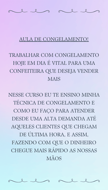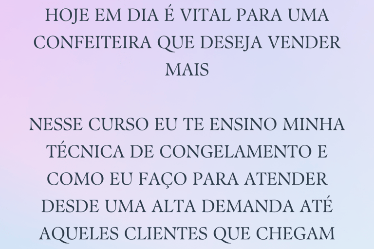 Você vai conhecer um pouco da minha historia, de como me tornei confeiteira referência na minha cidade, tudo isso construído ao longo de quase três décadas de trabalho e desenvolvimento!